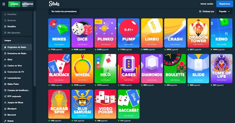 - Juegos exclusivos e innovadores: Los Stake Originals, como juego del avión Stake, Plinko y Mines, ofrecen una jugabilidad única y mecánicas diferentes a las de los juegos de casino tradicionales.